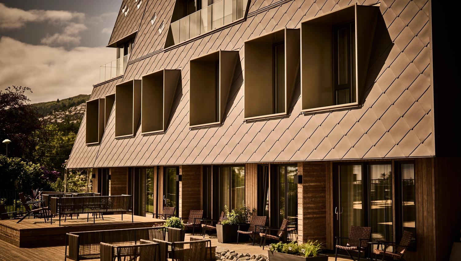 The boutique hotel is located on the hill in Bekkjarvik, just south of Bergen. It offers view of the harbor, the fjord, and mountains in Sunnhordland.