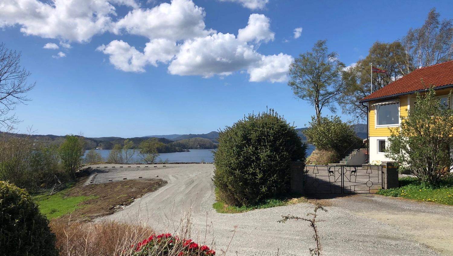 It is a gravel parking place with fantastic views, and a shop, restaurant and marina in 1.5 km distance, Haaheim Gaard (5 km) and Mandelhuset restaurant in Våge (7 km).