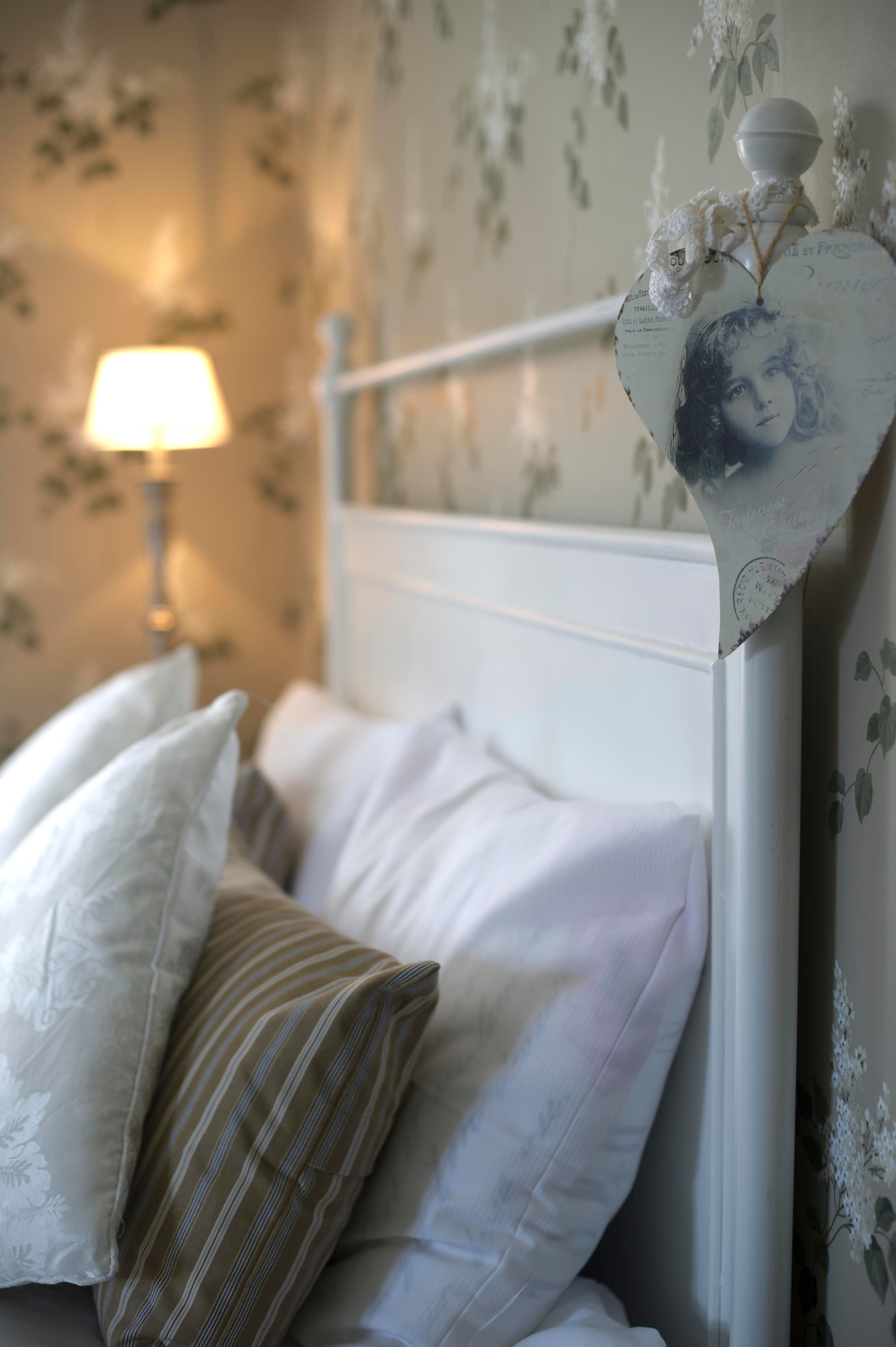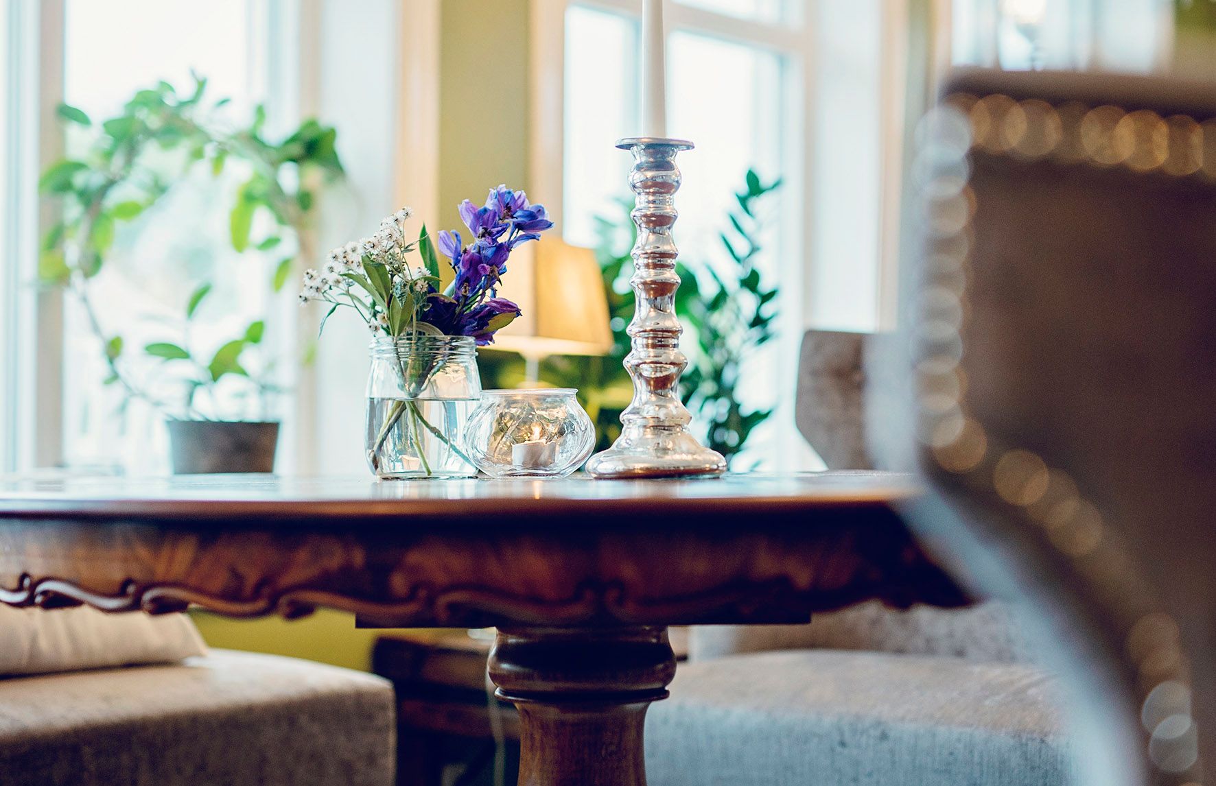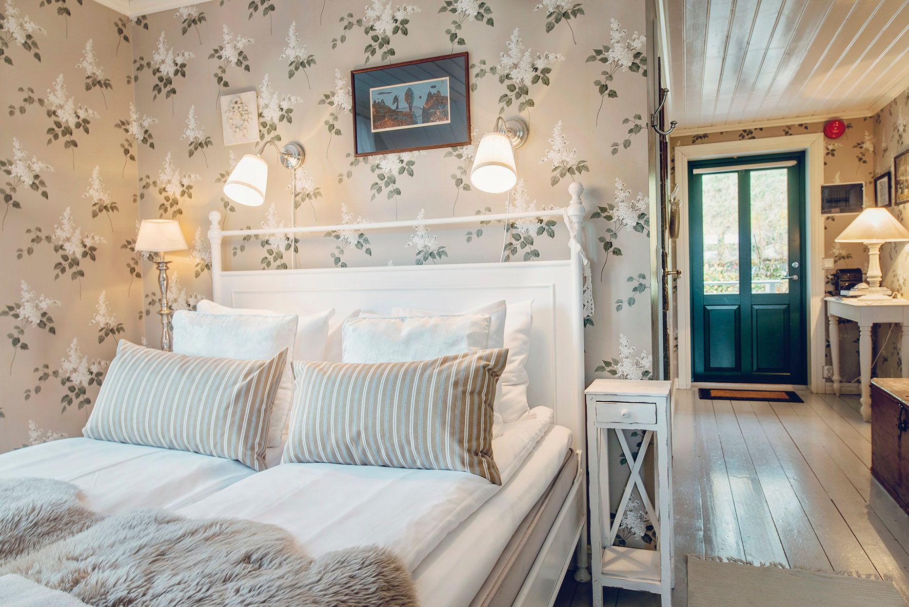 The interiors are inspired by historic manor houses, with reproduced wallpapers and carefully selected details. Each room has its own character, creating an intimate atmosphere that feels both elegant and grounded in place.
