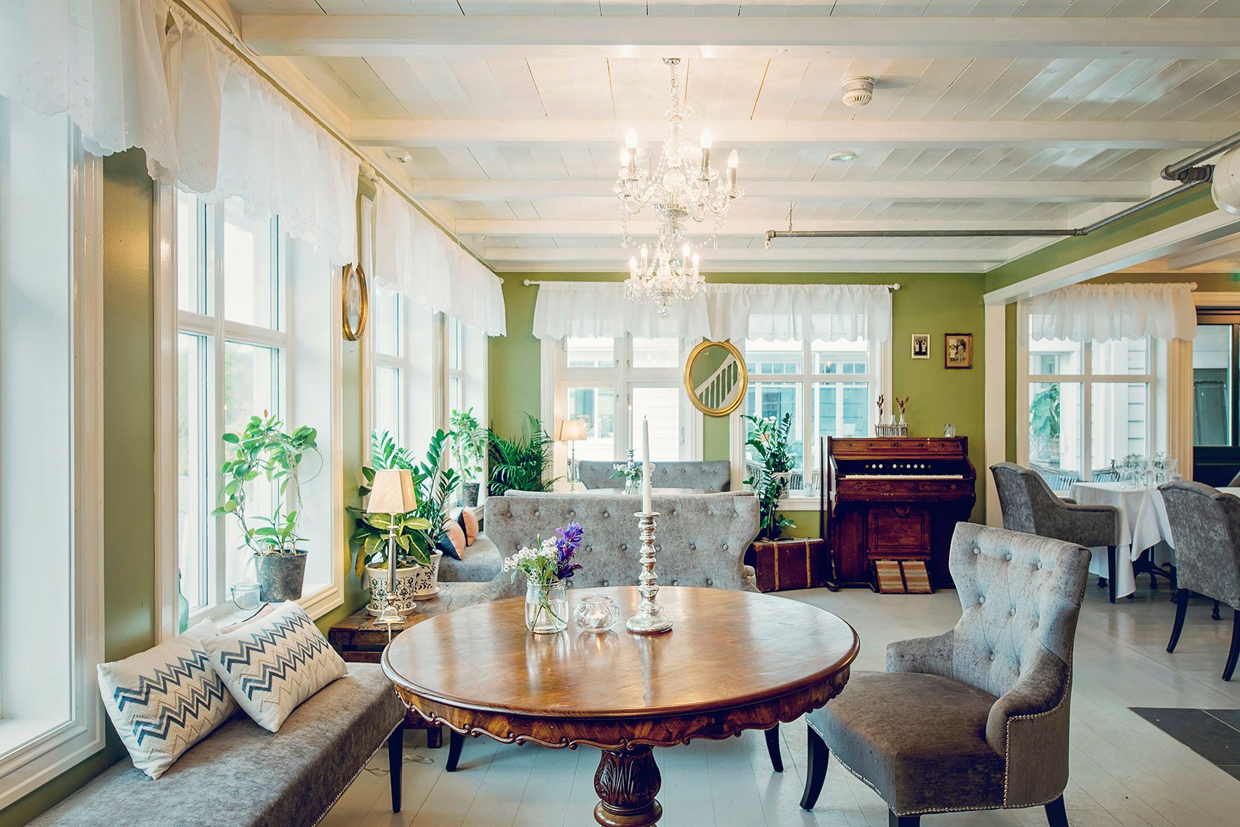 The restaurant serves seasonal cuisine based on local ingredients from Fjord Norway. Dinner is served in historic halls where conversations last longer and the pace naturally slows down.