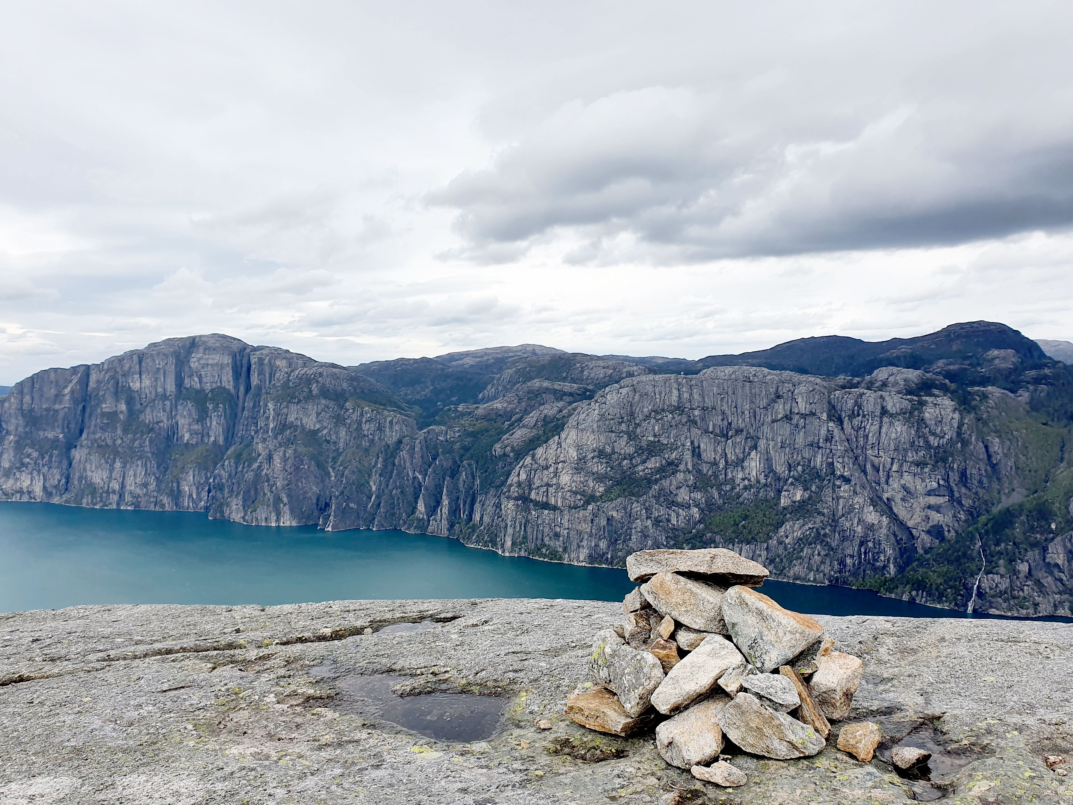 From Skrøyla, the hike takes you into the forest on a good path/carriageway. Along the way, you have good views down to Fossmark and the Lysefjord. After about 1 kilometre, the landscape opens up and you meet the river, which is crossed on a narrow bridge. This is a good place to quench your thirst and take a short break before starting the ascent. The cairned path first runs on bare bedrock, then through heather moorland and dense vegetation. At times the path is quite steep.