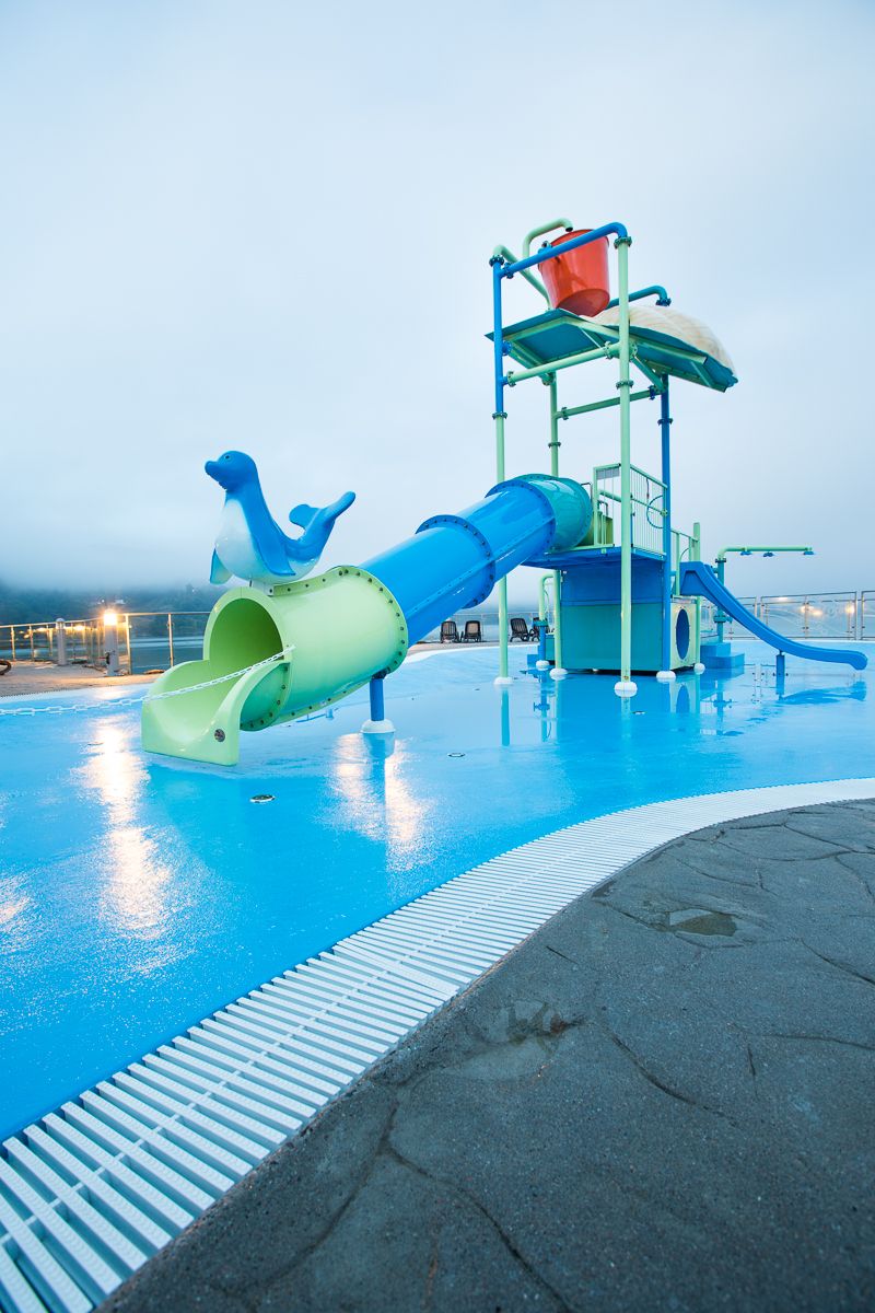 Sørlandsbadet also features an outdoor bathing island shaped like the mascot, the seal "Salto." On the bathing island, there's an activity area for the little ones and sun loungers for adults to enjoy during pleasant summer weather. Connecting to the island are 4 water slides. The bathing island is open during the summer season.