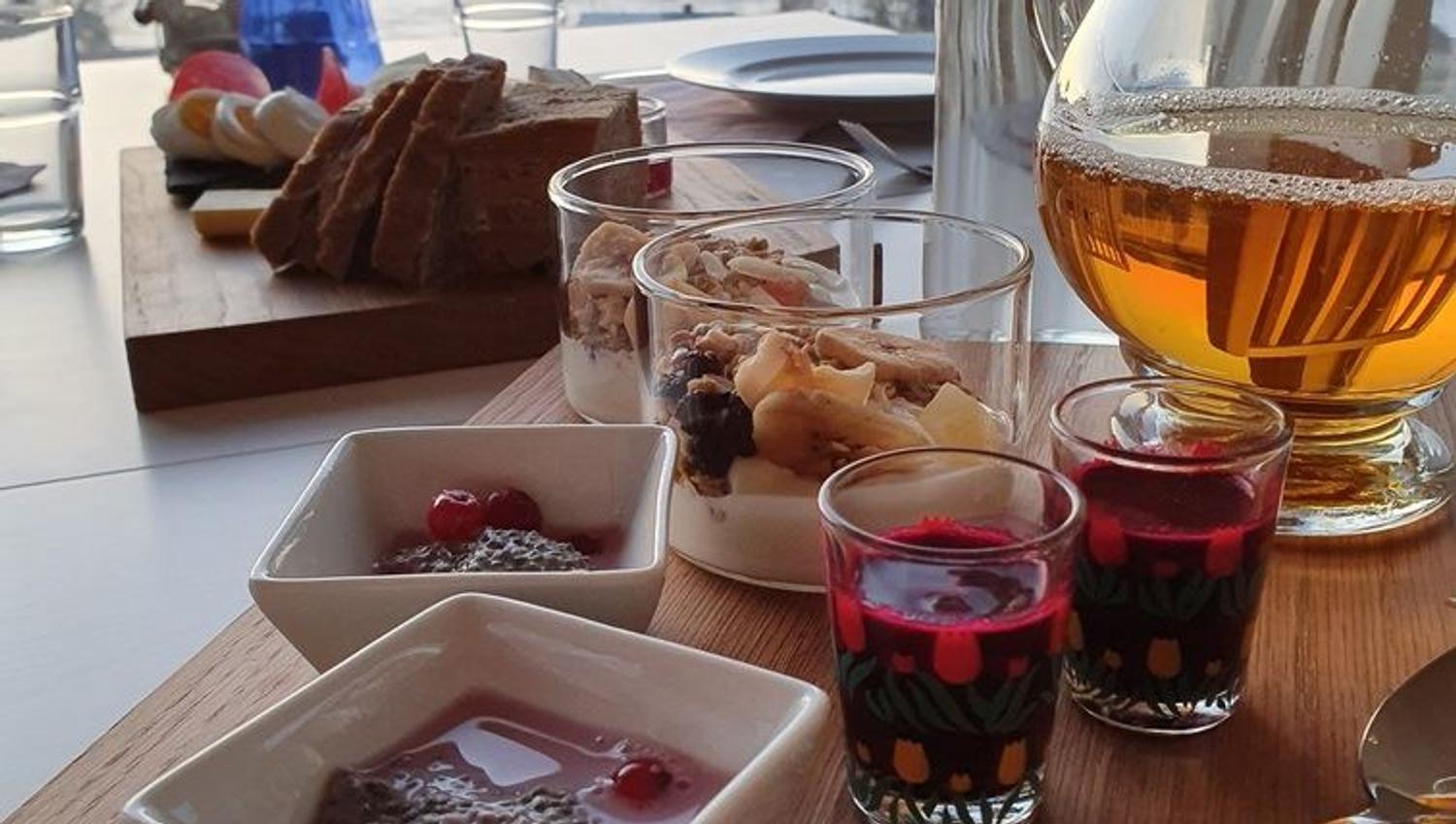 We offer accommodation with homemade food in beautiful surroundings, where the interior and buildings reflect both new and old history, accompanied by charming farm animals and lush northern Norwegian nature with many hiking opportunities. You can experience the northern lights right outside the door, enjoy mountain hikes in all seasons, go on fjord sightseeing tours by car, or join guided snowshoe hikes—or rent snowshoes and explore on your own. A visit to our wellness department is highly recommended. Choose between a wood-fired sauna or a relaxing bath in our Jacuzzi with a panoramic view—or enjoy both. We also offer ice bathing with a guide and access to a wood-fired sauna by the sea. The farm hotel can accommodate up to 20 guests in a mix of double and single rooms. Providing excellent service to our guests is a top priority. The kitchen at Yggdrasiltunet serves homemade Norwegian food, much of it produced on the farm using ingredients from the local area. We place great importance on natural and organic practices and do our best to serve you pure Norwegian flavors. Enjoy breakfast in our cozy dining room with a panoramic view, and look forward to tasting our homemade bread and eggs from our free-range hens. Our café is open from 11 AM (11:00) to 5PM (17:00). The restaurant is open from 7PM (19:00) to 9PM (21:00).